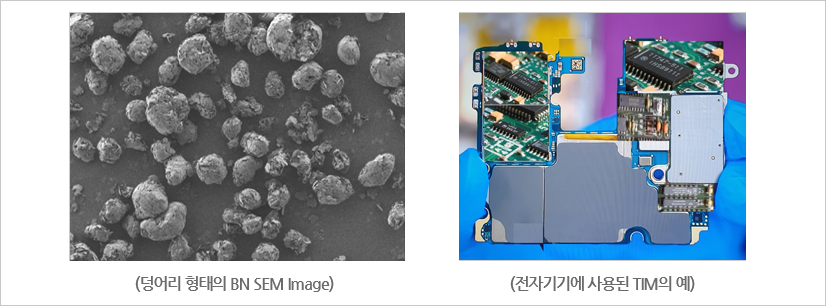 - 특히 질화붕소의 수직방향성 열전도성을 개선한 Agglomerated Type(덩어리 형태)은 분산성과 유동성이 우수하여, 계면열전달재(TIM)의 제조에 아주 편리하게 사용 할 수 있습니다.